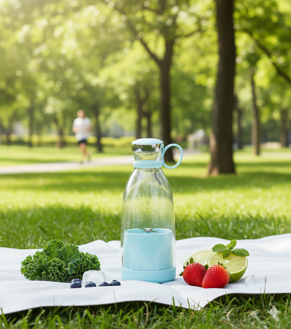 Text: Experience the freedom of blending wherever life takes you. Our GoFresh Juicer combines minimalist design with powerful performance, letting you prepare fresh juice in seconds — from your bedside to your workspace. Stay refreshed, energized, and effortlessly healthy every day.